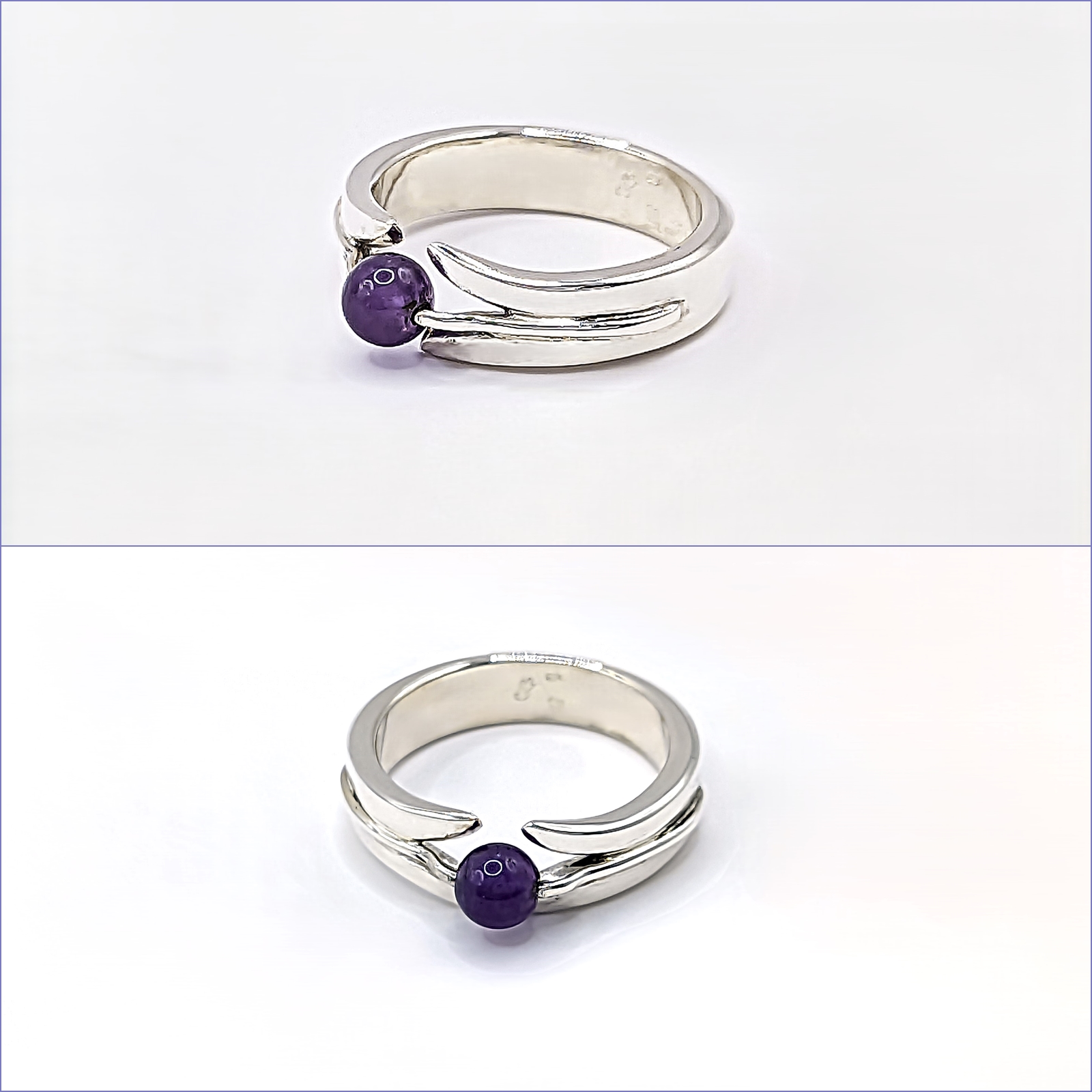 Egyedi gyűrű kis ametiszt gyönggyel. Különlegessége a gyöngy befoglalásának módja.