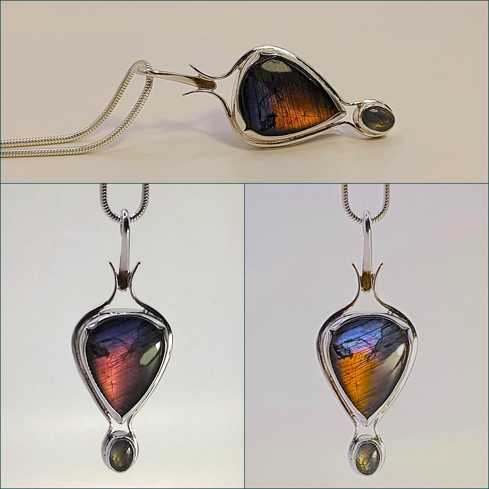 A labradorit, amely ragyogásával magához vonzza a tekintetet sokféle színárnyalatban fordul elő. Ebben a kőben a lila, az óarany és a kék szín dominál. Egészen különleges, ritkán találok ilyen változatos színvilágú labradoritot. A medálban alul is látható egy kis labradorit, annak a színe leginkább kék.
