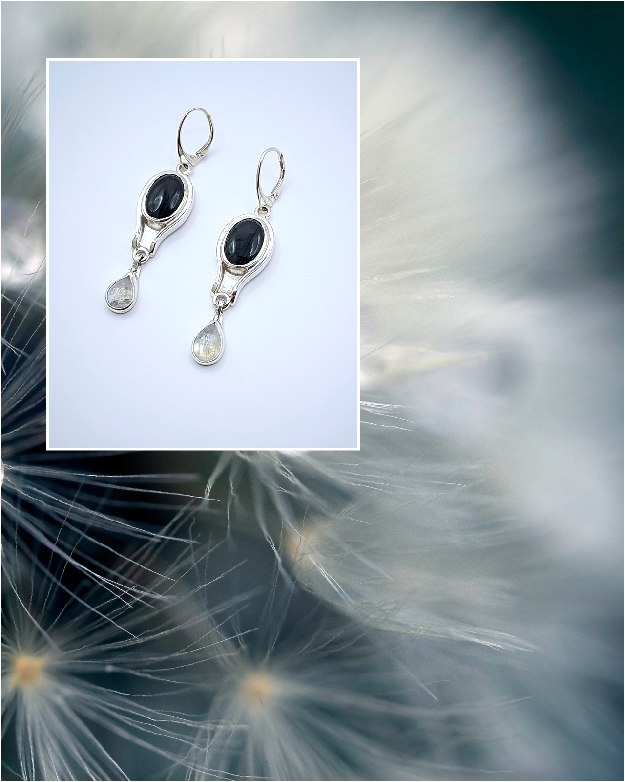 A fekete ónix mellé a szivárvány labradoritot választottam (melyet sokan tévesen kék holdkő néven ismernek). A két kő szépen kiegészíti egymást. A fekete és az áttetsző kristály-fehér, melyben időnként feldereng egy halovány kék árnyalat és teszi izgalmassá ezt az ásványt.
